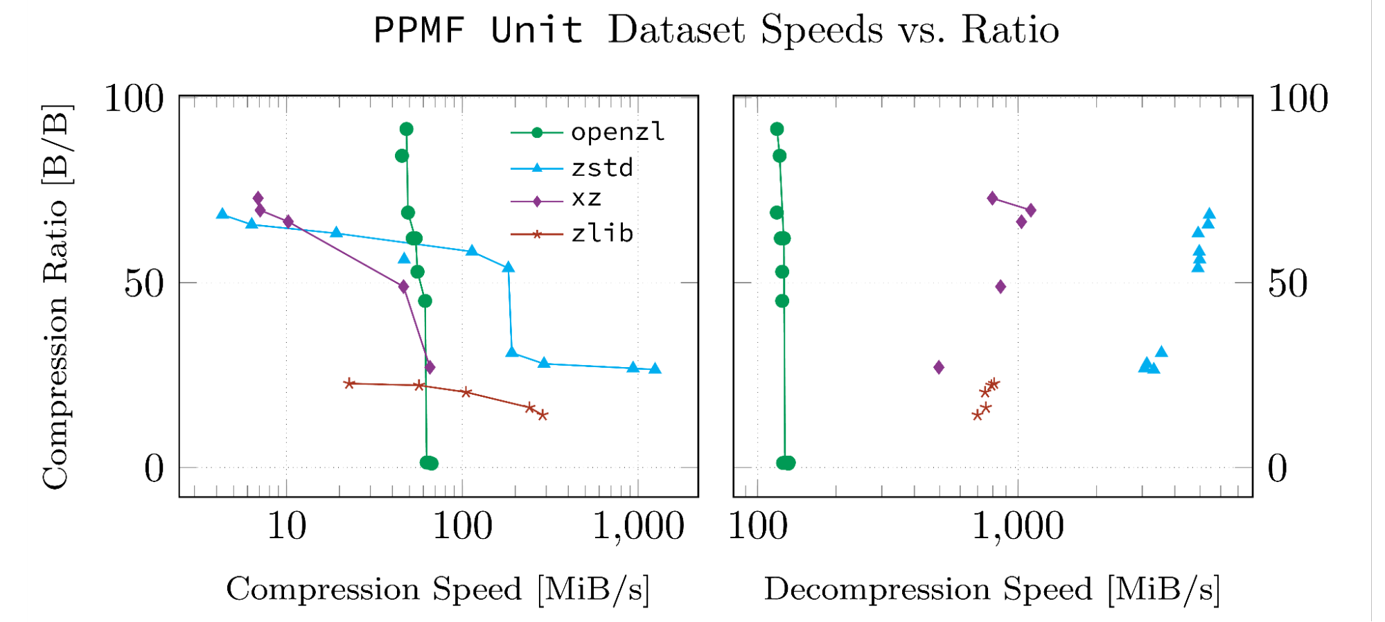 OpenZL, through its offline training capabilities, is also able to offer a wide range of configurations in the tradeoff space of compression ratio, compression speed, and decompression speed. Unlike traditional compressors, which offer configuration by setting a compression level, OpenZL offers configuration by serializing the compressor graph. This allows an immense amount of flexibility to select diverse tradeoffs.
