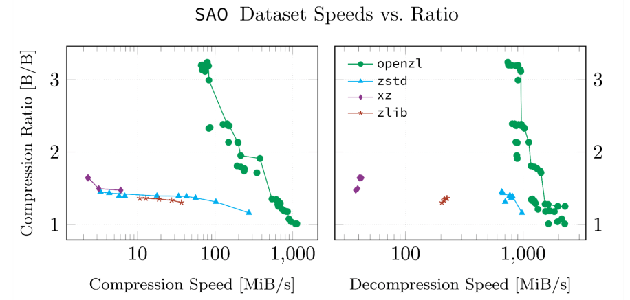 Figure 1 — SAO. These figures show compression speed and decompression speed vs. ratio for SAO comparing OpenZL with three general compression tools. As shown in the example, OpenZL destructures the star records into columns for each field, and then the trainer learns how to best compress each field to produce a set of OpenZL configurations offering a wide range of tradeoffs.