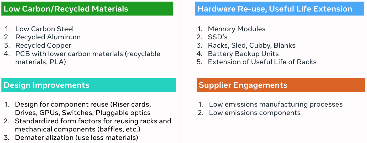 • At Meta, we’ve been able to significantly reduce the carbon footprint of our data centers by integrating several design strategies such as modularity, reuse, retrofitting, dematerialization, using greener materials, and extended hardware lifecycles, Meta can significantly reduce the carbon footprint of its data center infrastructure.