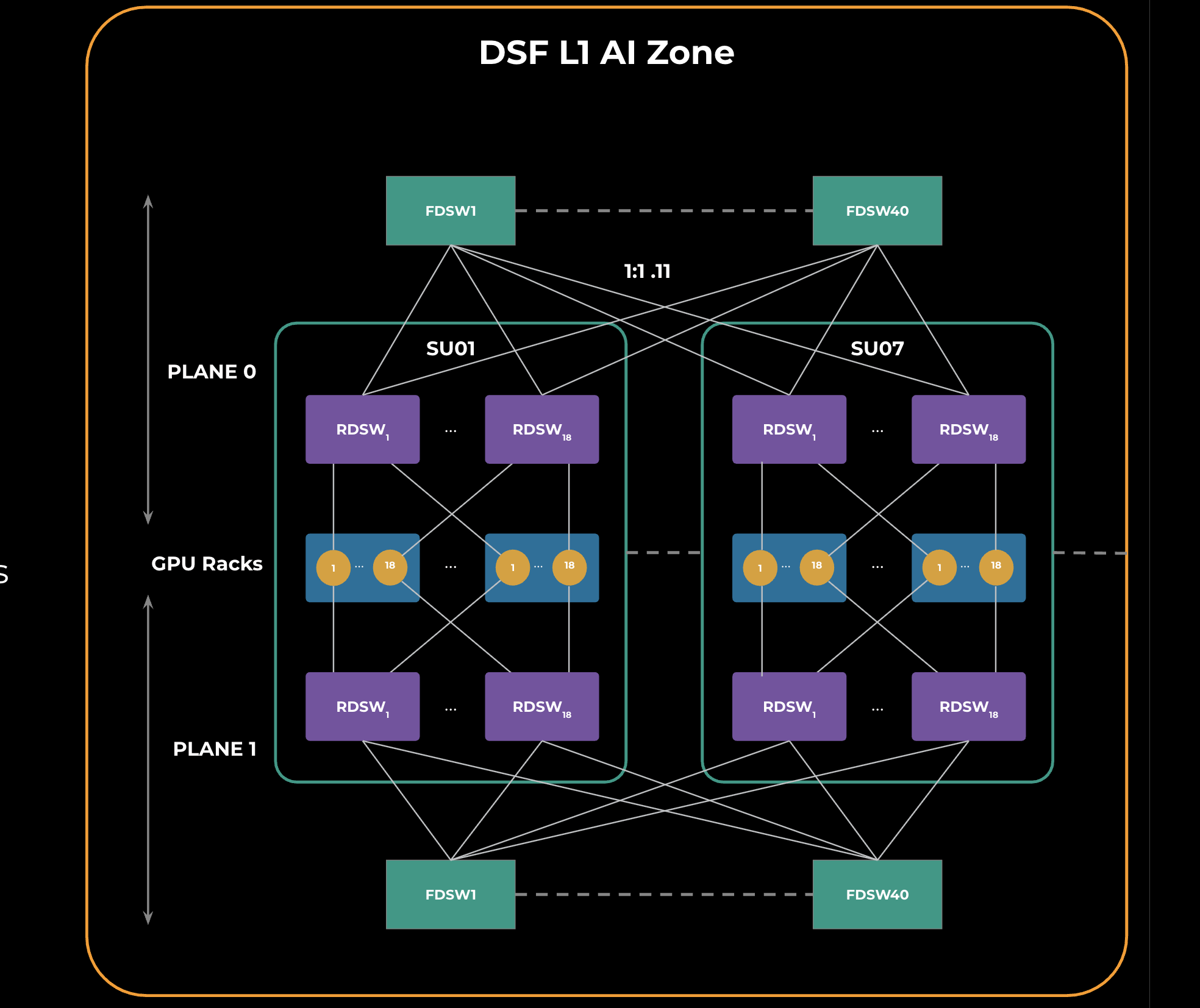 To support high GPU scale in a single AI zone, two network planes that are identical to each other are created. This is called a DSF L1 zone and is a building block for larger GenAI clusters, as we will see in the next section.