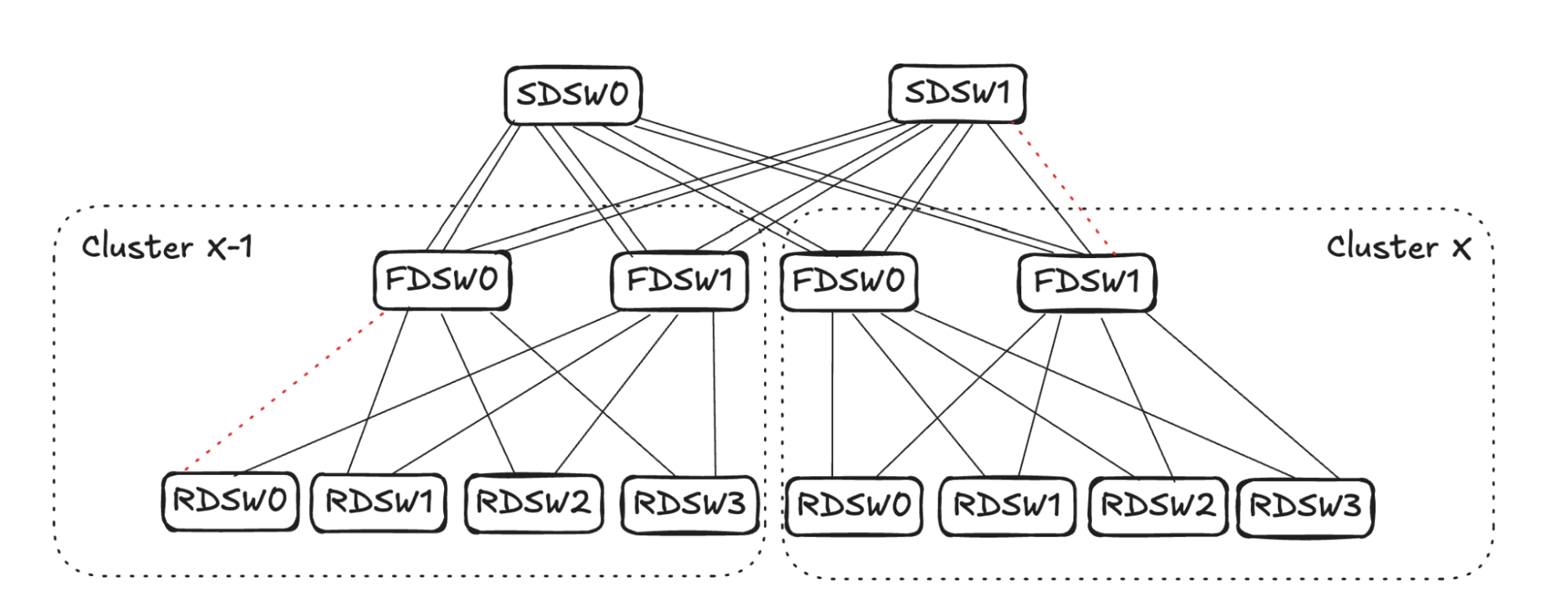 Note in Figure 14 that FDSW0 in Cluster X-1 already has one link failure connecting RDSW0. The input and output capacity towards Cluster X is already balanced on FDSW0, thus finishing propagation in this direction.