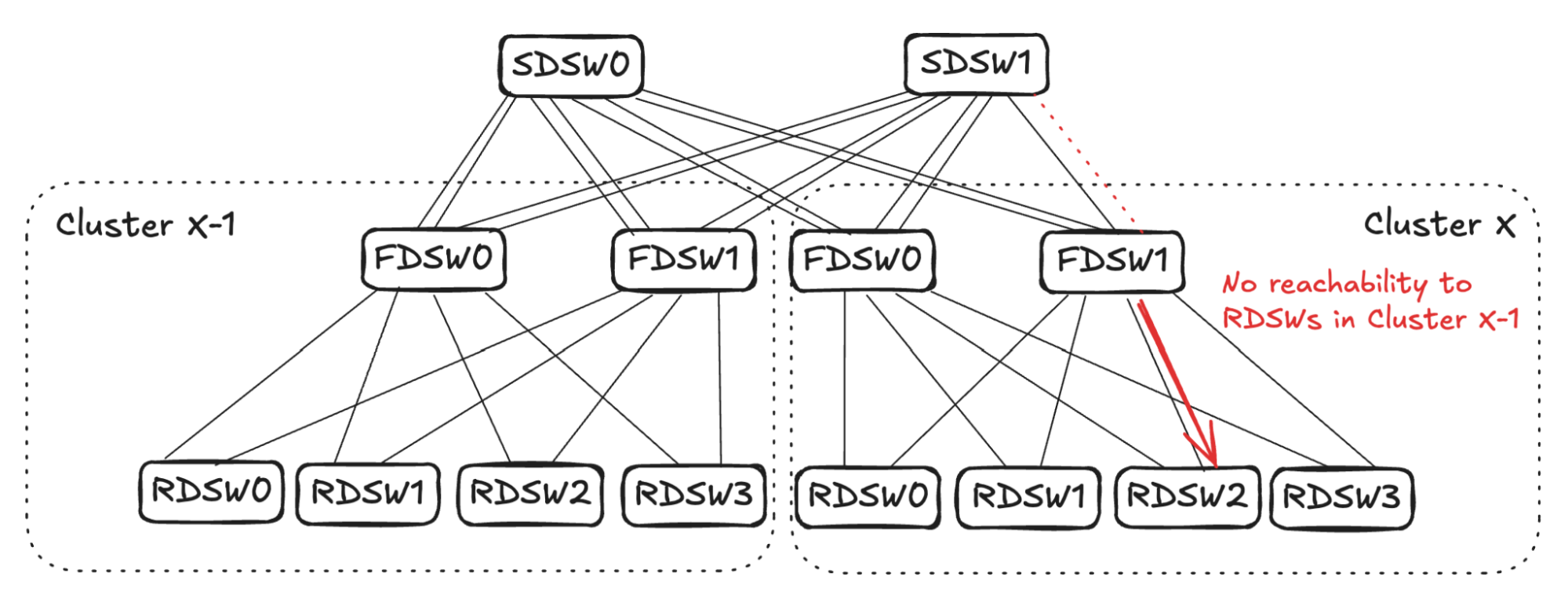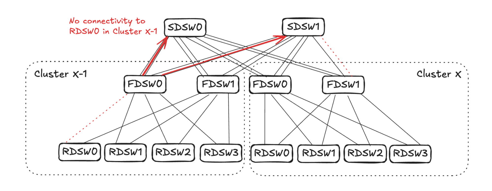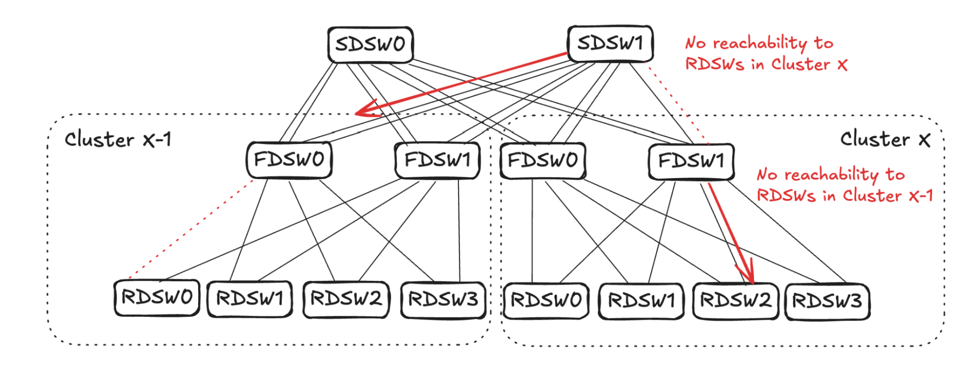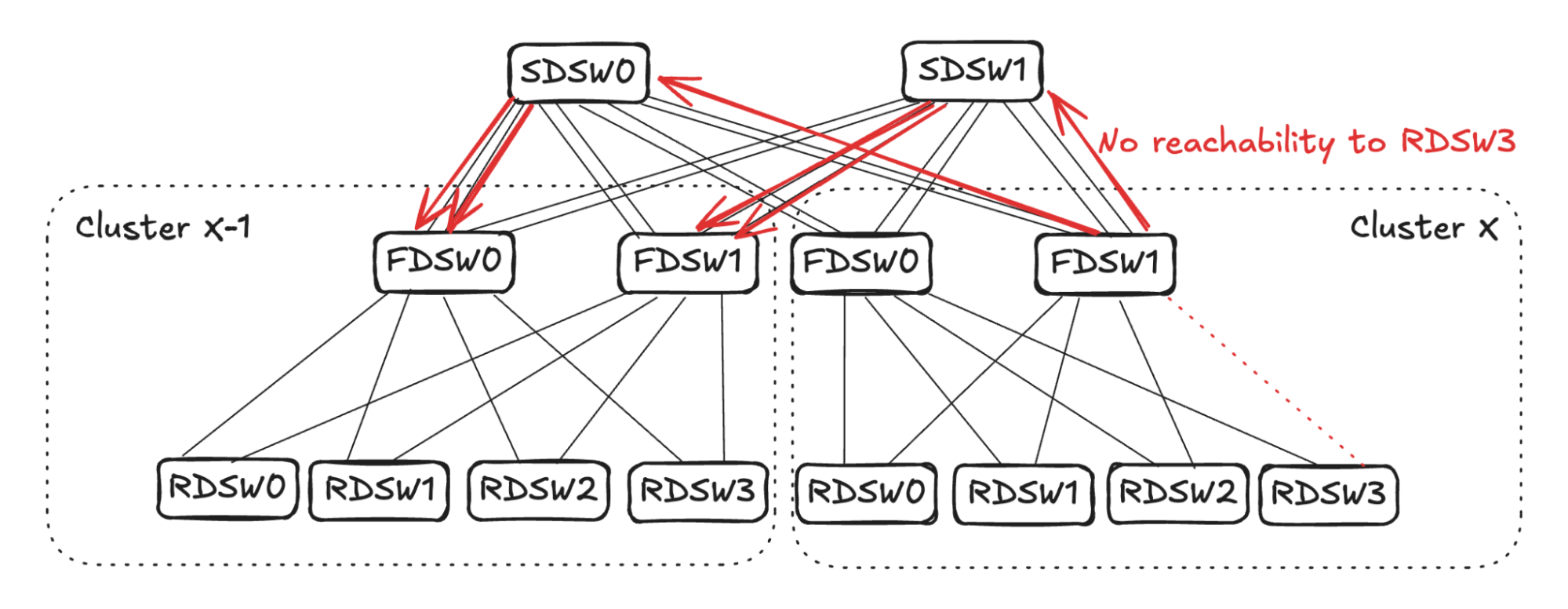 Assume Cluster X FDSW1 randomly picks the link to RDSW2. It will stop advertising reachability to all RDSWs in Cluster X-1. Note that the same link can still be utilized for intra-cluster traffic, as it has full reachability to RDSWs in Cluster X.