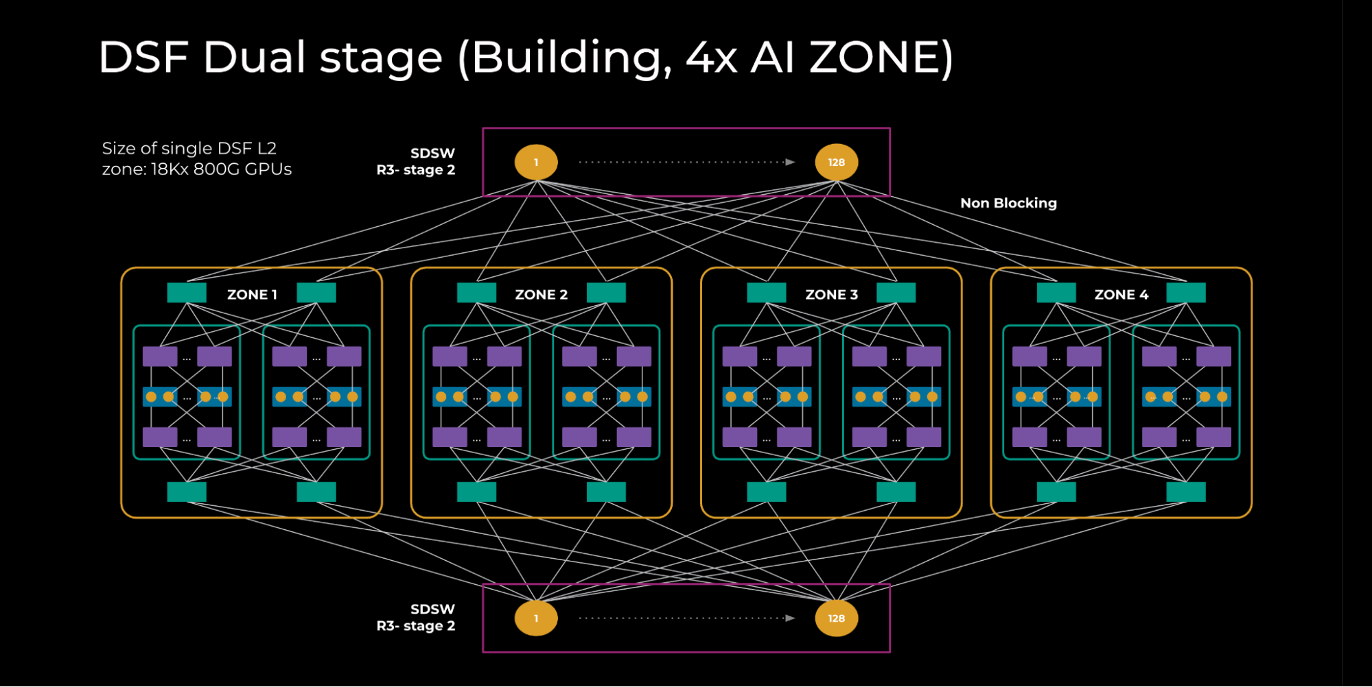 As depicted in Figure 2 (below) we interconnected 4x DSF L1 zones through a second stage of spine DSF switches (SDSWs). SDSWs use the same hardware as FDSWs and aggregate DSF L1 zones, enabling them to act as a single DSF fabric. This is a non-blocking topology providing an interconnected GPU scale of 18K x 800G GPUs.