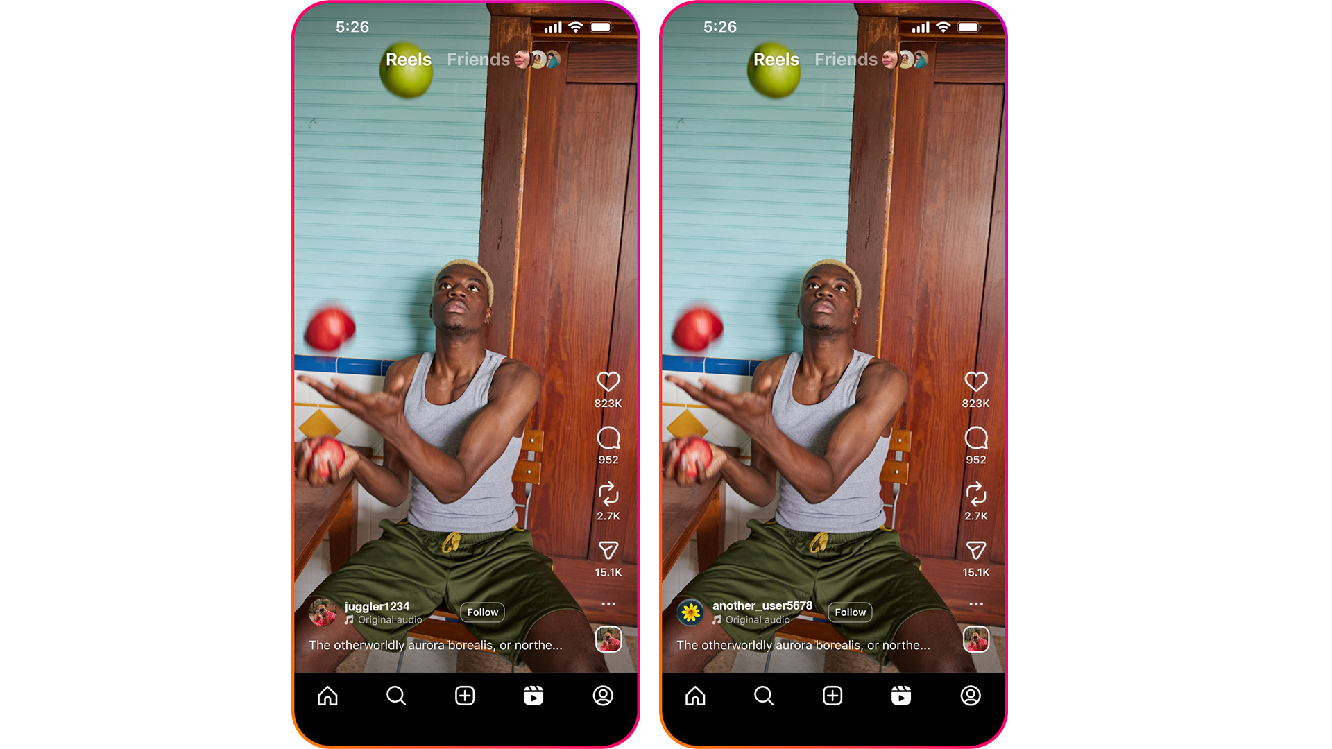Figure 1: Screenshots of what appear to be the same video uploaded by two users on Instagram Reels.