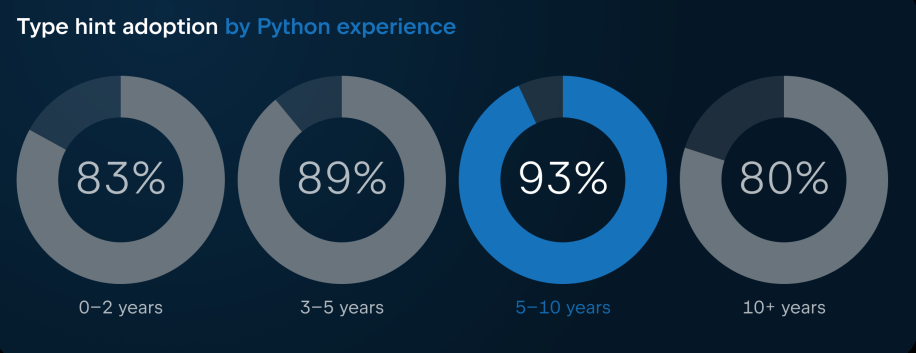 Percent of respondents who use types “often” or “always," segmented by years of Python experience.