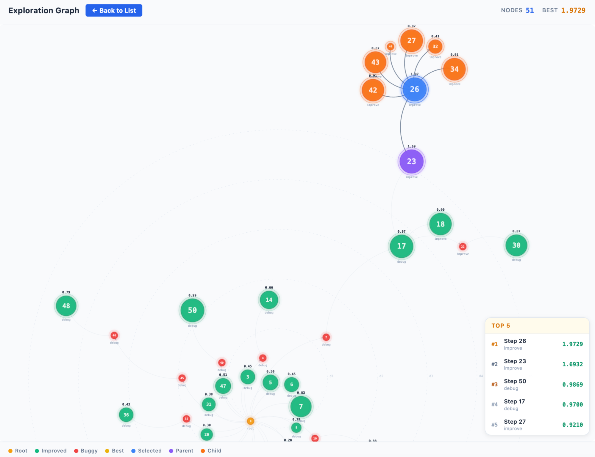 - Iterates steps 1-4, exploring the search tree until the termination criteria are met — either a performance target is achieved, the search budget is exhausted, or progress stalls.